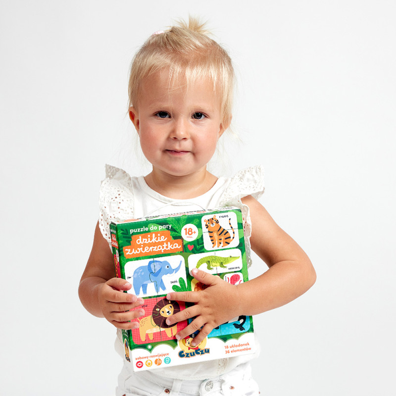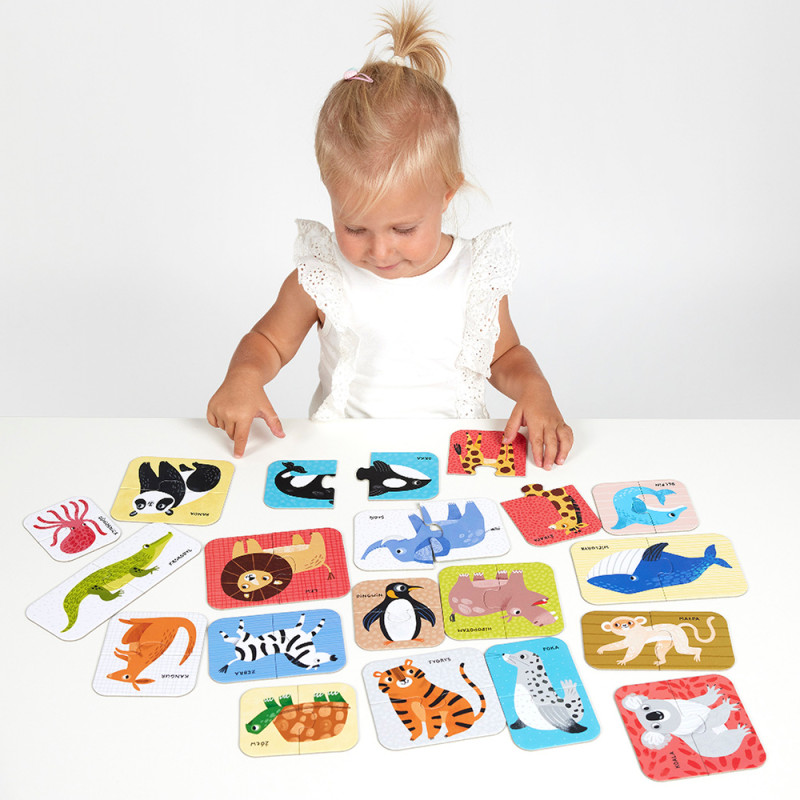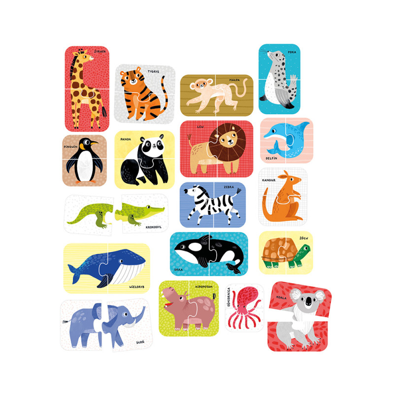 Edukacyjny zestaw zawiera 18 dużych dwuelementowych układanek. To świetny pomysł na pierwsze lub kolejne w kolekcji puzzle z tradycyjnymi połączeniami. Piękne ilustracje przedstawiają uwielbiane przez dzieci i bardzo sympatyczne zwierzęta z różnych stron świata. Zabawa z puzzlami znakomicie rozwija spostrzegawczość, zręczność rączek i koordynację ręka-oko oraz wyobraźnię.