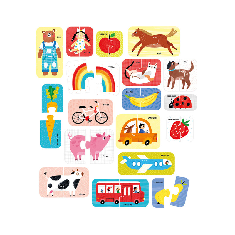 Edukacyjne puzzle to doskonały pomysł na mądry prezent dla ciekawego świata malucha. Zestaw zawiera aż 18 dużych, dwuelementowych układanek. Zabawa z nimi to idealny początek puzzlowej przygody. Piękne, kolorowe grafiki przedstawiają to, co dzieci znają i lubią z najbliższego otoczenia. Układanie puzzli doskonali sprawność rączek, spostrzegawczość, cierpliwość i logiczne myślenie.