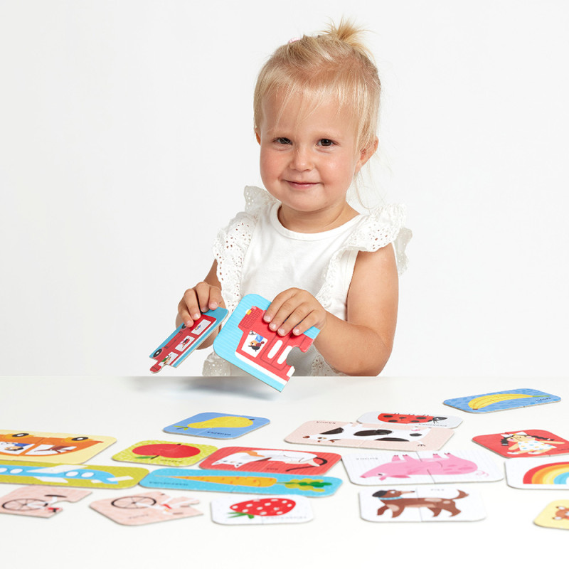 Bawcie się i odkrywajcie świat wokół Was! Trenujcie sprawność dłoni, dopasowując połówki obrazków. Ćwiczcie wzrok i wyszykujcie detale na ilustracjach. Nazywanie przedmiotów czy zwierzątek na ilustracjach to trening pamięci i nauka nowych słów. Trenujcie buzię, wydając śmieszne dźwięki i podejmując próby mówienia.