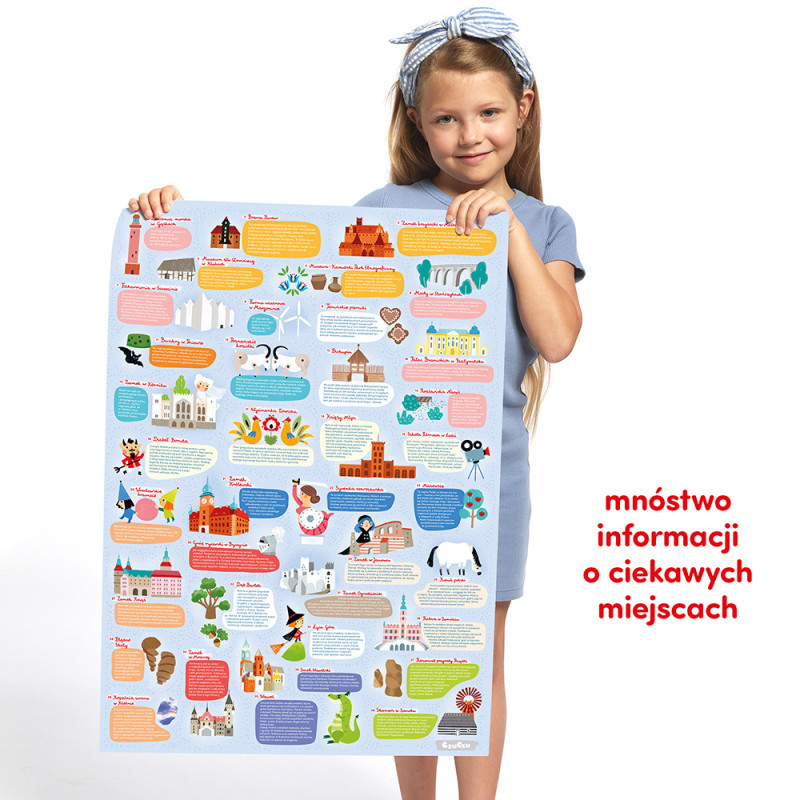 Duża, kolorowa i pełna szczegółów ilustracja przedstawia mapę Polski, warte odwiedzenia miejsca, charakterystyczne rośliny i zwierzęta. Jej ułożenie to nie lada wyzwanie i wspaniała zabawa, która inspiruje do poszerzania wiedzy na temat historii, kultury i przyrody. Na ramce puzzli umieściliśmy mnóstwo szczegółów do wyszukania na ilustracji. To nie koniec – do zestawu dołączyliśmy duży plakat pełen informacji o ciekawych miejscach w Polsce. Edukacyjne puzzle to doskonały pomysł na prezent dla przedszkolaka. Zaproście przyjaciół do wspólnej zabawy!