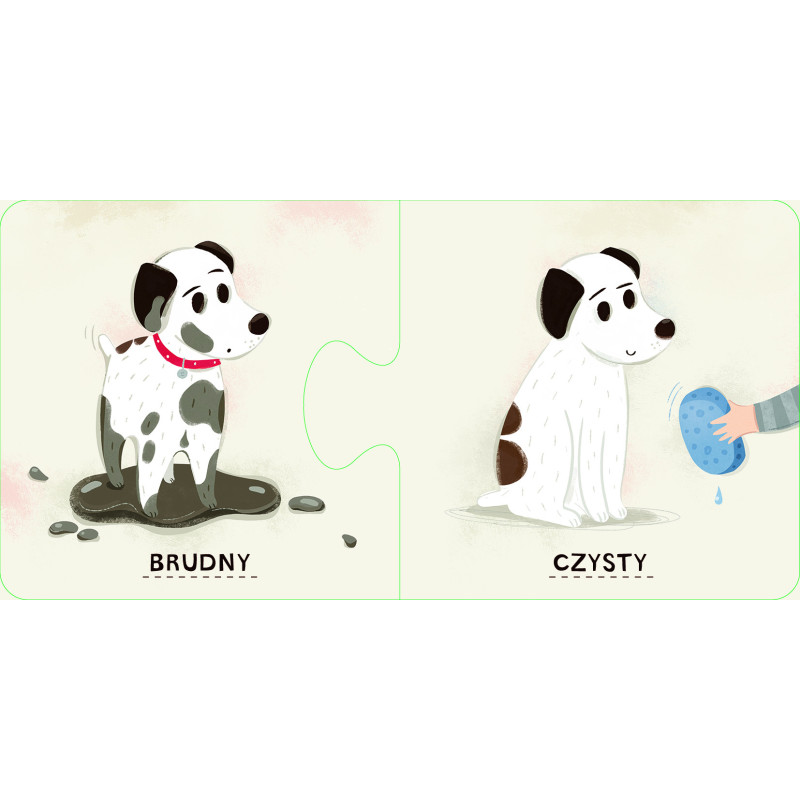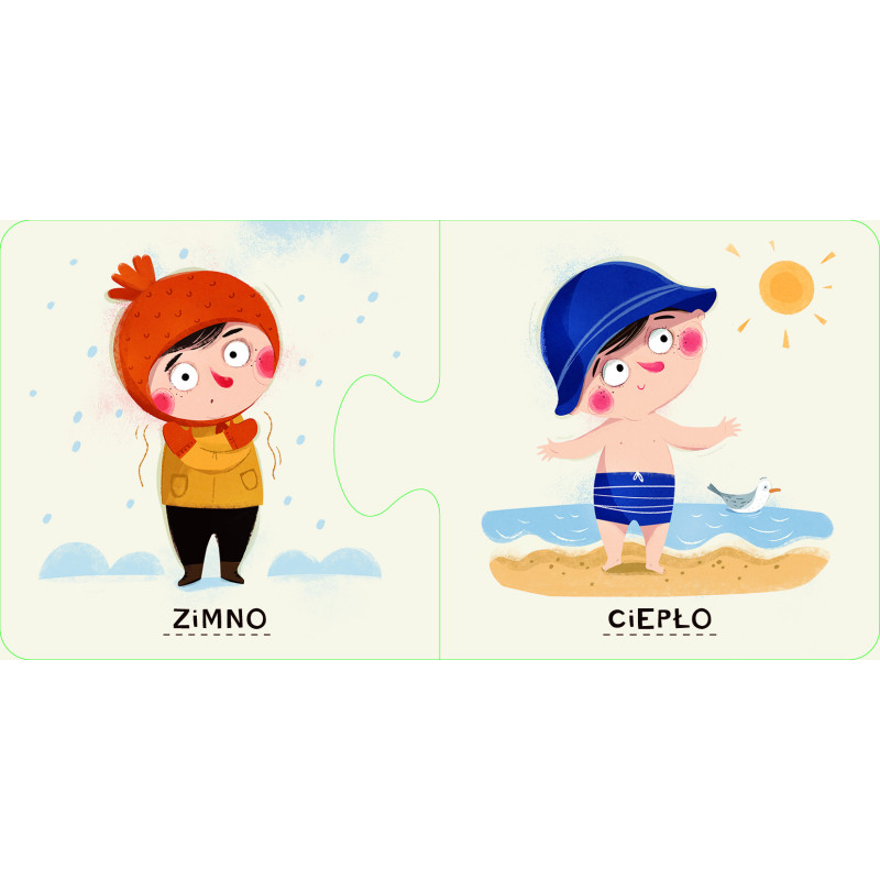 Zabawka składa się z 20 elementów, czyli 10 par obrazków, wśród których należy znaleźć przeciwieństwa: mały i duży, stare i nowe, mokra i sucha, zdrowy i chory, smutny i wesoły, głodny i najedzony, lekkie i ciężkie, zimno i ciepło, cicho i głośno, brudny i czysty.