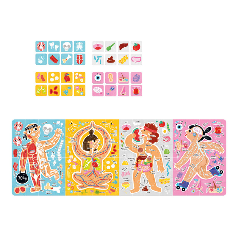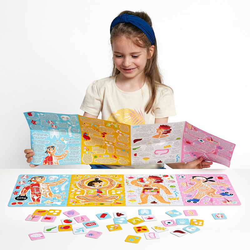 Bawcie się w kreatywny sposób, przyjmując jednocześnie solidną dawkę wiedzy! Ułóżcie puzzle i bacznie obejrzyjcie ilustrację, rozmawiając o tym, co ona przedstawia. Nazywajcie narządy i układy. Przeczytajcie ciekawostki z plakatu i sięgnijcie do dalszych źródeł i rozmawiajcie o działaniu . Zabawa to najlepszy sposób na wprowadzanie i utrwalanie wiedzy. Dokładajcie elementy, trenując bystre oko i refleks, jeśli zagracie na czas. Rysujcie, wymyślajcie historie, czytajcie. Dajcie się ponieść wyobraźni! Ten zestaw pozycja obowiązkowa na półce przedszkolaka.