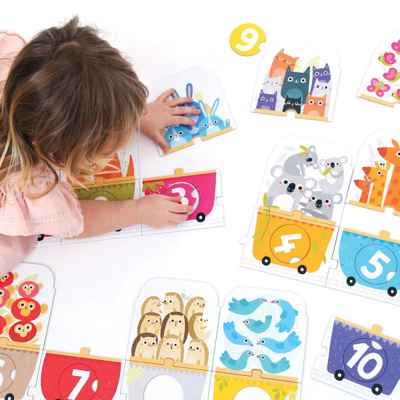 Puzzle to układanka wielokrotnego wyboru - elementy można dowolnie ze sobą łączyć. W kolorowych wagonach siedzą zwierzątka, którym trzeba dopasować odpowiednią cyferkę. Puzzle dzięki różnym kształtom rozwijają umiejętności manualne. Zestaw jest także świetną propozycją poznania zwierząt.