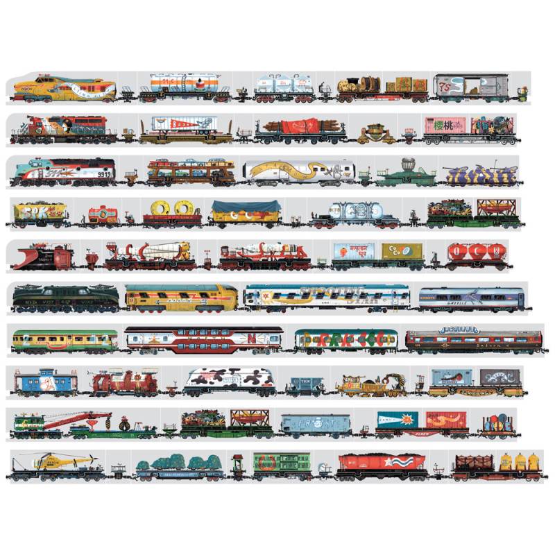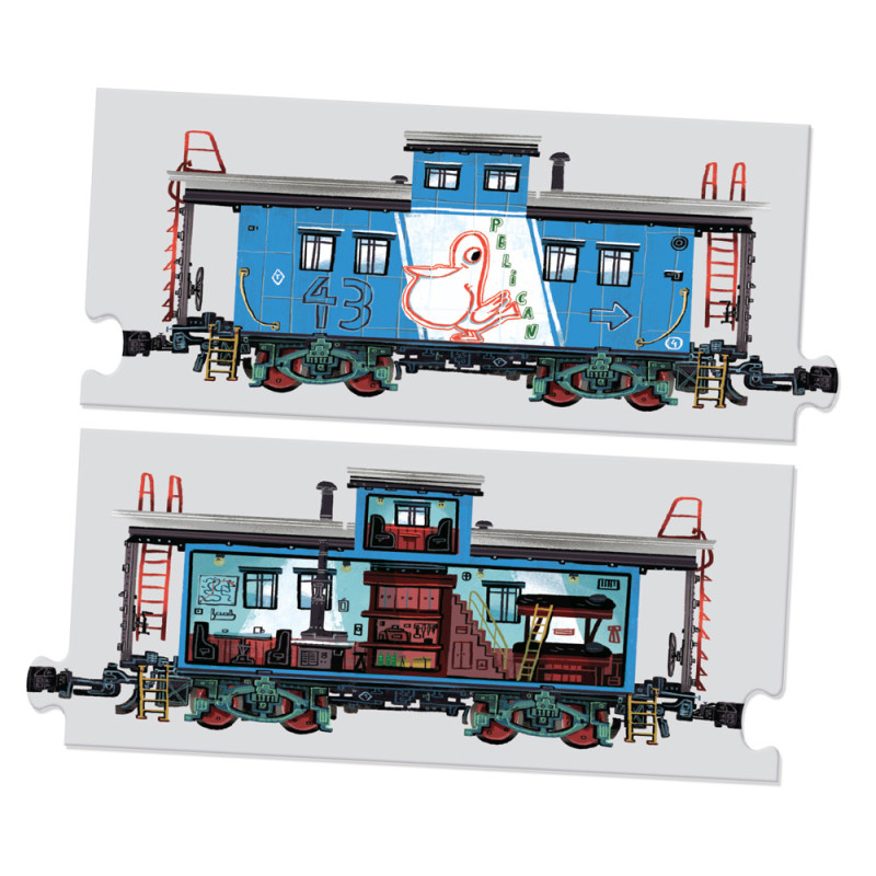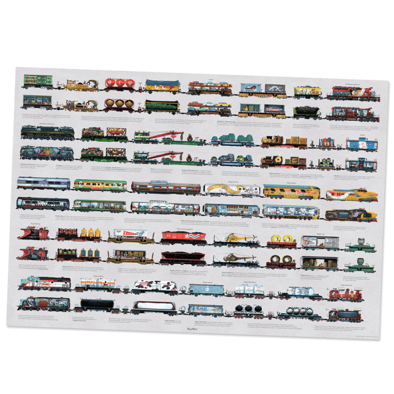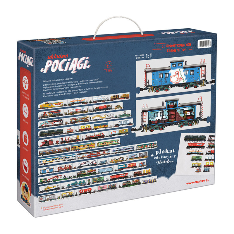 Kreatywny zestaw puzzli zawiera 104 elementy, w tym 56 dwustronnych, oraz duży dwustronny plakat edukacyjny z ciekawostkami o pociągach.Wszystkie elementy połączone razem tworzą rekordowo długi pociąg (aż 9,5 m!). Wagony można dowolnie układać i przekładać, co daje nieskończoną liczbę kombinacji i pozwala na tworzenie własnych składów.
