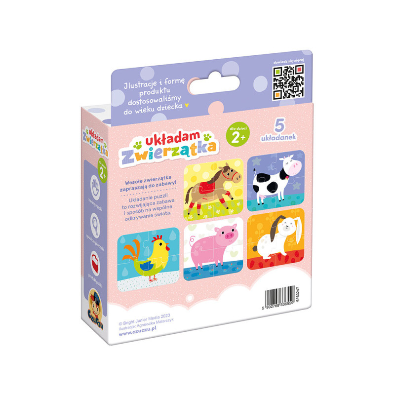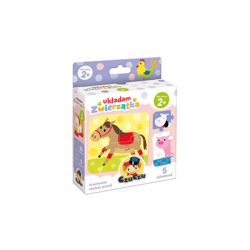 Ułóżcie wspólnie puzzle i poznajcie mieszkańców gospodarstwa. Możecie też razem poznawać odgłosy zwierzątek i wymyślać ciekawe historie z wiejskiej zagrody.Proste układanki z dużymi, łatwymi do połączenia elementami na pewno polubią maluchy zaczynające swoją przygodę z puzzlami. Układanie jest świetnym treningiem spostrzegawczości i koordynacji ręka-oko. Małe, podróżne opakowanie sprawia, że puzzle zawsze można mieć przy sobie. Zestaw zawiera 20 elementów (5 układanek)