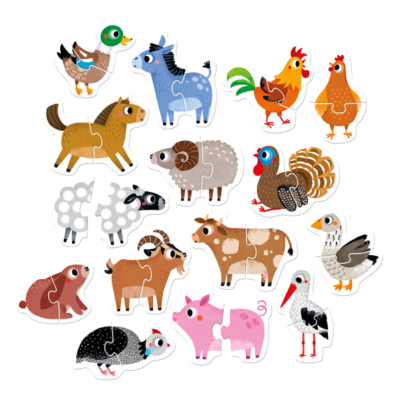 - Układanki dwuelementowe przedstawiają 15 uroczych zwierzaków z gospodarstwa.