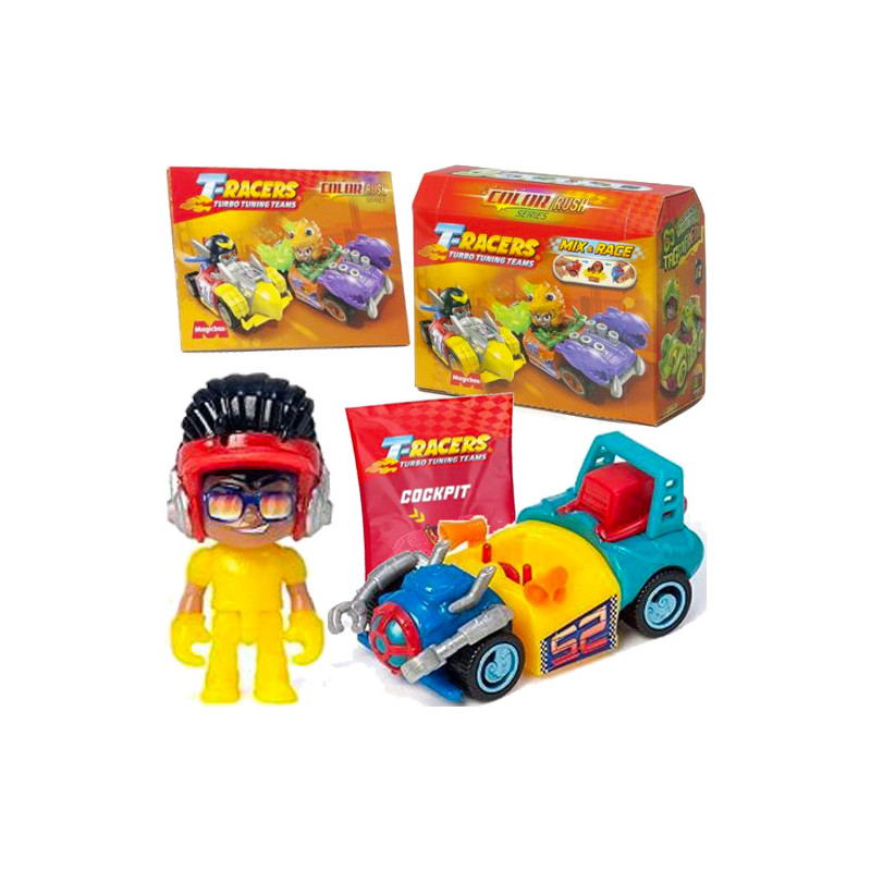 T-Racers powracają w nowej serii Color Rush! Poznaj 8 nowych kierowców oraz nowe samochody i ich moce. Pamiętaj, że wszystkie części możesz wymieniać z innymi T-Racersami – przód auta, tył, kokpit, koła, a nawet kierowców… Liczba możliwych kombinacji jest ogromna! Czy uda Ci się znaleźć ultrarzadkiego Tagmaleona? On zmienia kolor pod wpływem ciepła!