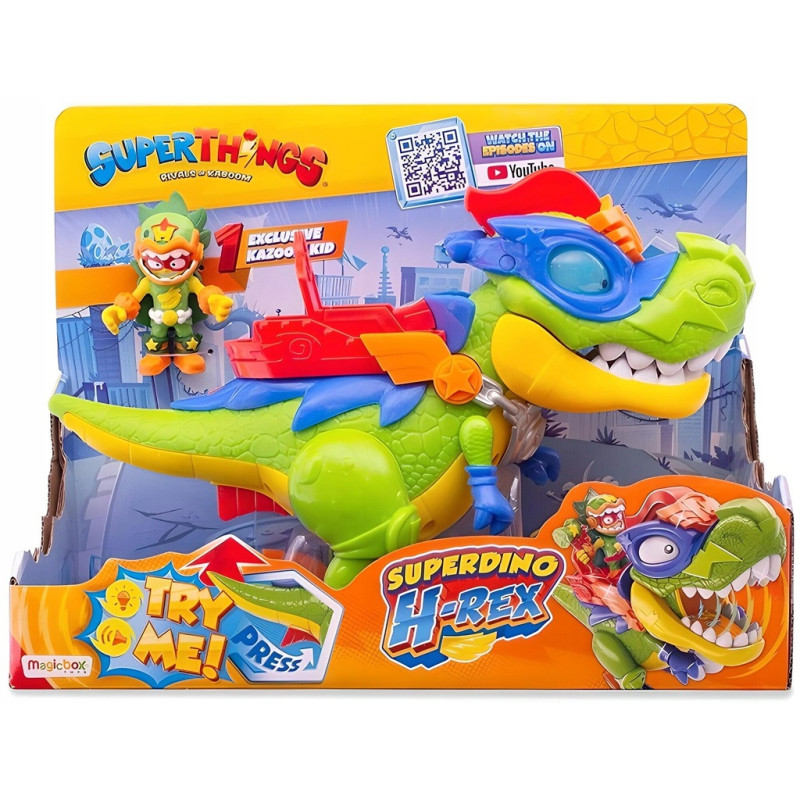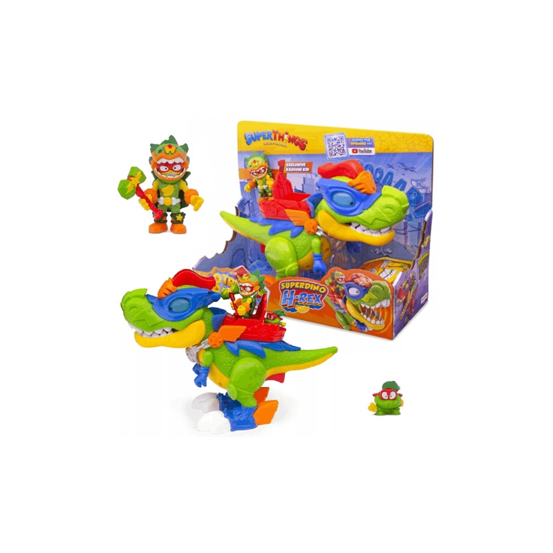 Dinozaury przybywają do Kaboom City! Superdino H-Rex jest sprzymierzeńcem bohaterów. Jego stawy pozwalają mu poruszać się z pełną prędkością, by łapać złoczyńców. Ściśnij jego ogon, a otworzy szczęki, a jego oczy zaświecą się i będzie ryczał jak nigdy dotąd! Ruszaj po nich!