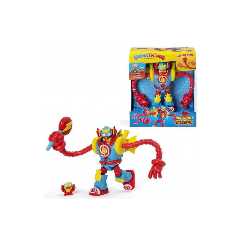 - 1 Robo‑Superbot Sugarfun – wielokolorowy robot‑złoczyńca o żywych, kontrastowych barwach z giętkimi długimi rękami.
